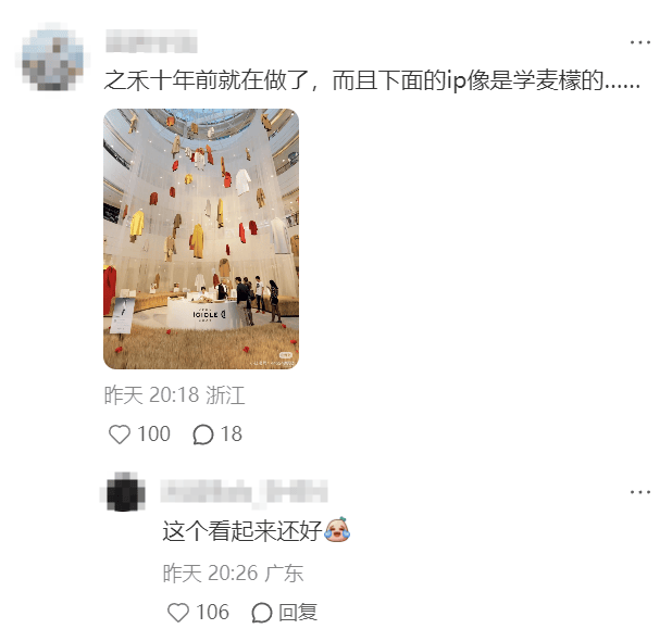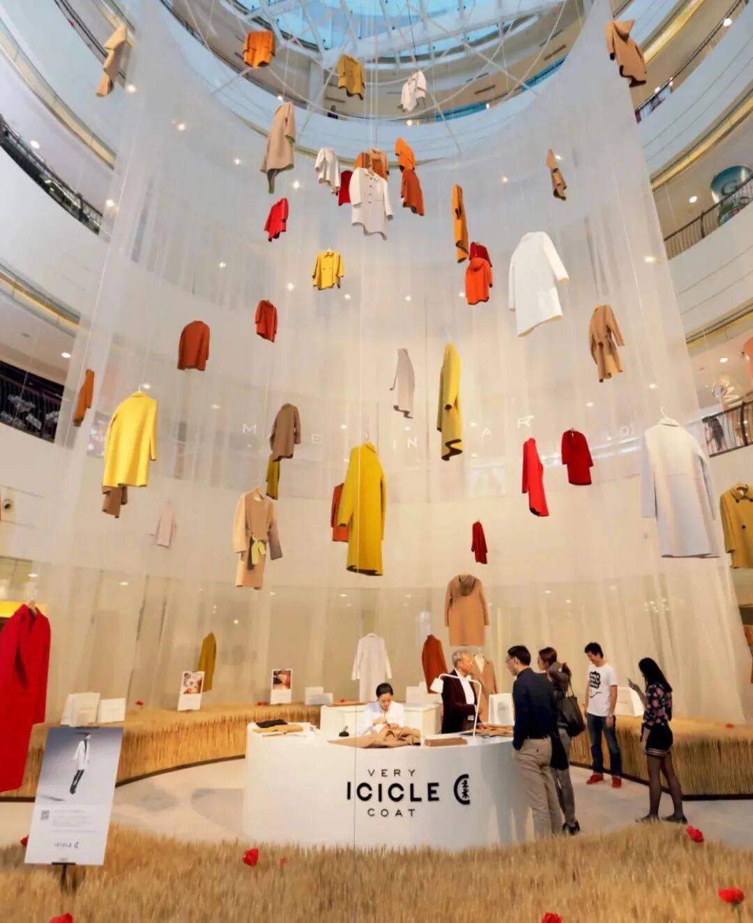 “把衣服挂在天上” 本身是一种中性的展陈手法,但不能盲目模仿艺术装置,目标用户能否因为衣服高高挂起,就消费上万元购买大衣值得品牌方多多思考。