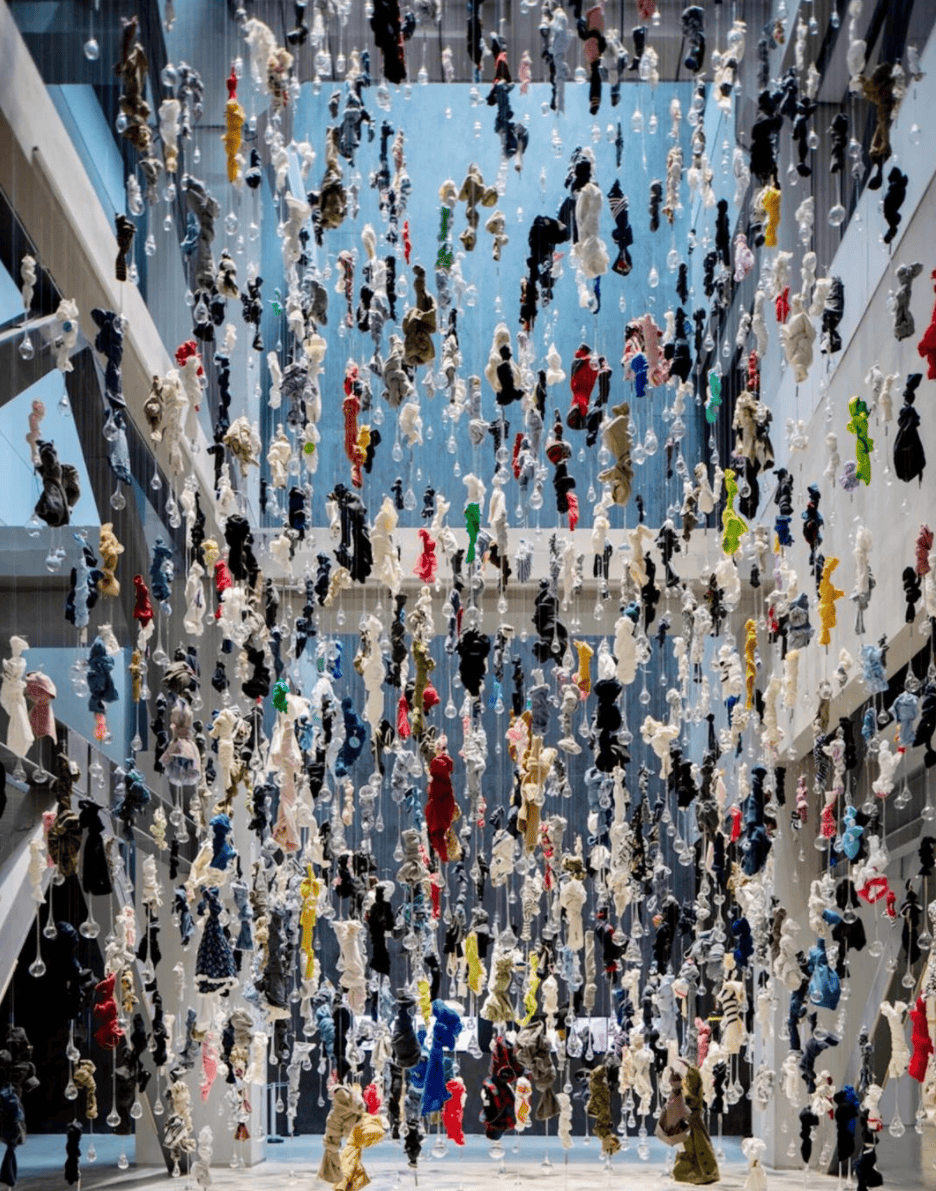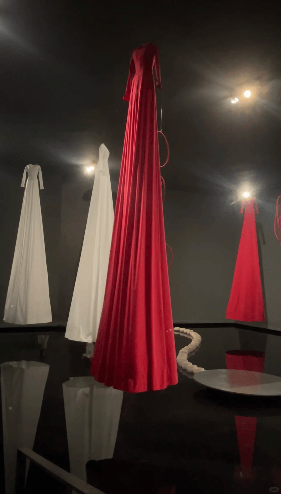 这些玻璃器皿和衣物被透明鱼线悬挂在展厅中,形成图片里高低错落的视觉效果。