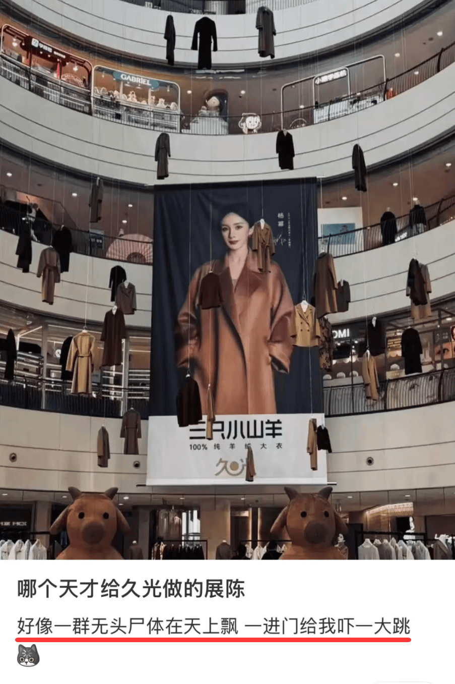 “无头大衣”事件:杨幂代言的三只小山羊在上海南京路静安久光百货的展陈引发争议。商场中庭悬挂的数十件长大衣,离远看像“无头尸体”天上飘,吓哭小朋友,接到大量投诉。因合作协议限制,商场无法提前撤展,最终在12月15日展期结束当天撤下吊衣展陈,只保留下方展台正常售卖商品。这一事件表明品牌在公共空间宣传时,不能盲目模仿艺术装置,需兼顾不同群体接受程度。