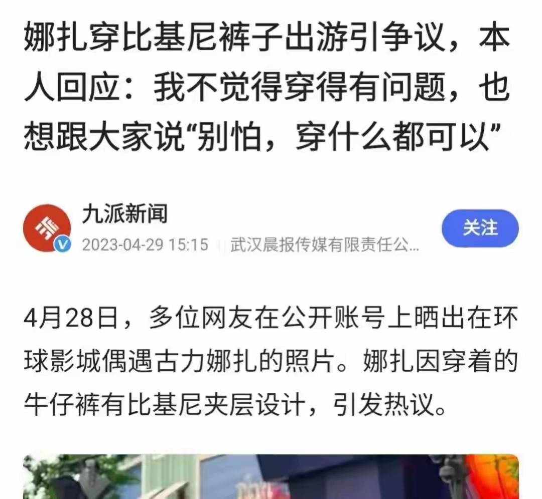要做个简单的对比:一个演员可能需要数年时光精心磨练演技,但拍一组露身材的写真,或者打一针医美,几天就能登上热搜。就像热依扎凭借机场的一身低胸装,短短24小时内,话题度就突破了3亿,虽然遭遇了一些批评,但随之而来的商业合作却让她赚得盆满钵满。而娜扎晒出的那身疑似露内裤的穿搭,尽管被网友批评低俗,却依然一度卖断货,商家狂赚一笔。对资本来说,流量就是金钱,露身材带来的曝光量远远比一部好的作品更能带来收益。