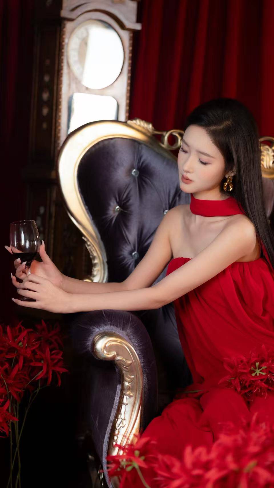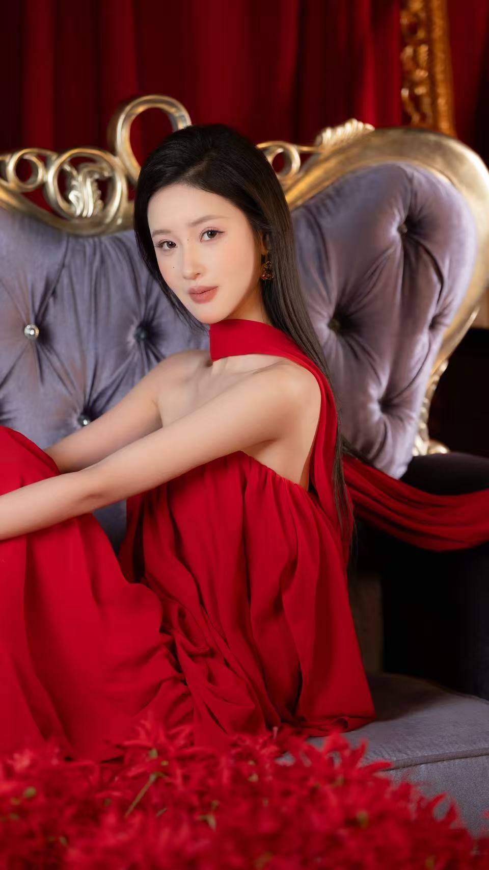 作为演员,刘一一始终在角色与自我之间寻找平衡。在这组大片中,她没有刻意追求戏剧化的表情,而是用松弛的肢体语言传递情绪:或手持红酒杯闭目凝神,或斜倚沙发舒展手臂,红裙随动作漾起柔美的褶皱,与身前盛放的红色花朵相映成趣。这种“不费力的高级感”,恰恰源自她对表演的深刻理解——好的表达从来不是外放的刻意,而是由内而外的自然流露。无论是镜头前的定格瞬间,还是片场里的角色塑造,她都习惯于沉下心来,让情绪通过细节慢慢流淌,这也让她在新生代演员中,拥有了独树一帜的辨识度。