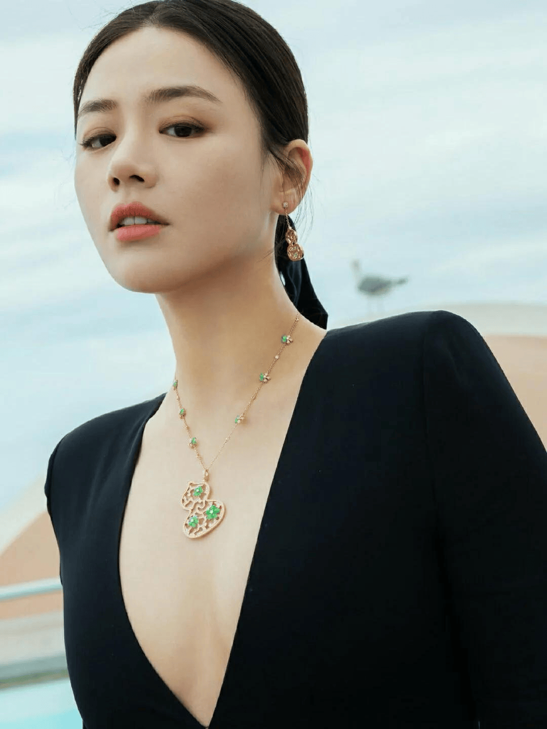 那抹蓝不张扬,却与冷白肤色、利落下颌线及修长天鹅颈形成极致冲撞。
