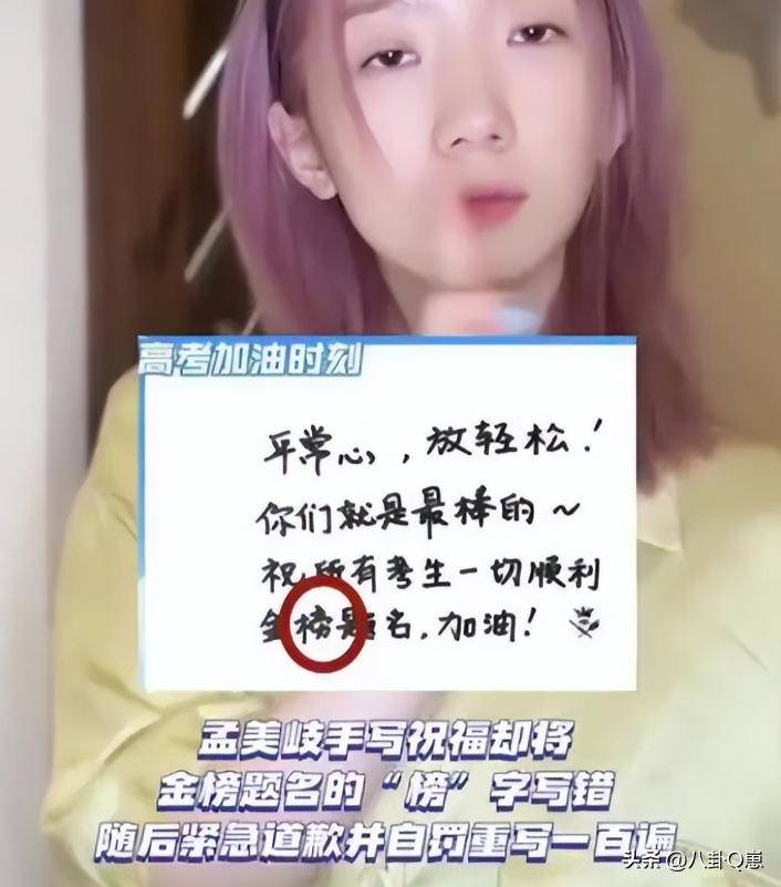 女星孟美岐,参加某节目时,被要求写下金榜题名四个字。按理说,这是一道送分题,但孟美岐却实打实地写错了榜字。网友们纷纷指正,大家都不敢相信她竟然连这么简单的字都不会写。这已经不是她第一次犯错了,之前她写纯甄的甄字也出现过错误,大家还可以理解为笔画太多。但这次连最简单的榜字都写错,这就让人有些怀疑她是否存在真正的基础问题了。