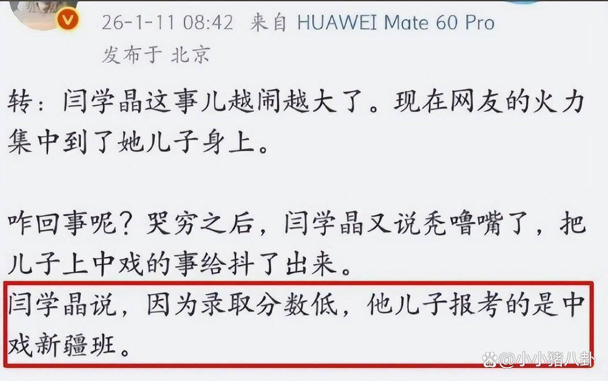 最开始大家还只是觉得她道歉太假,像是临时赶稿子交差。你说你搞错了事,忘本了,可字里行间没一点认错的劲儿,倒像在演苦情戏,指望观众心疼她这个“老母亲”。结果话音刚落,就有网友顺藤摸瓜,翻出她直播时亲口说过的一句闲话——儿子成绩一般,靠的是新疆班的特殊政策进的中戏。这一句嘴快,等于亲手引爆了自家火药桶。