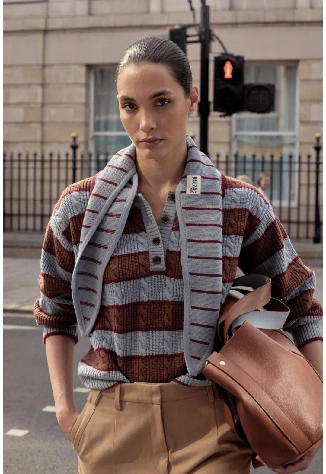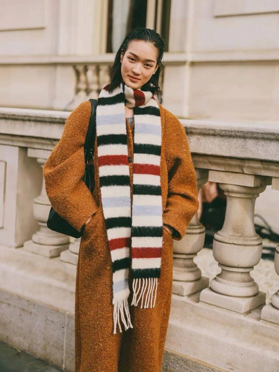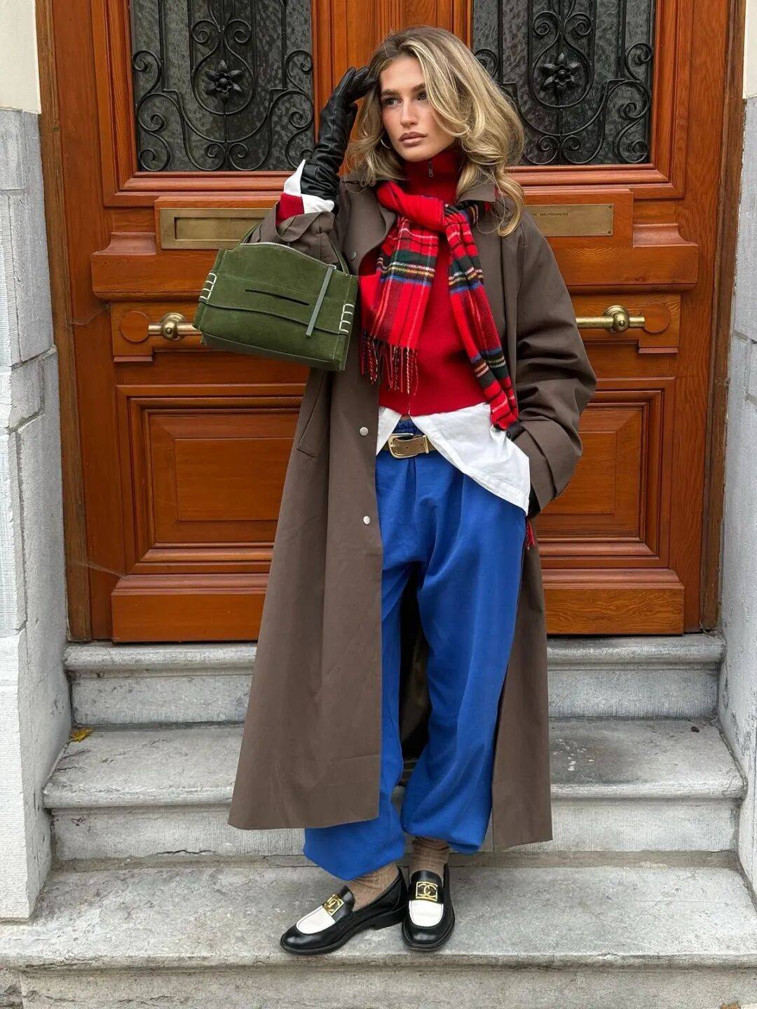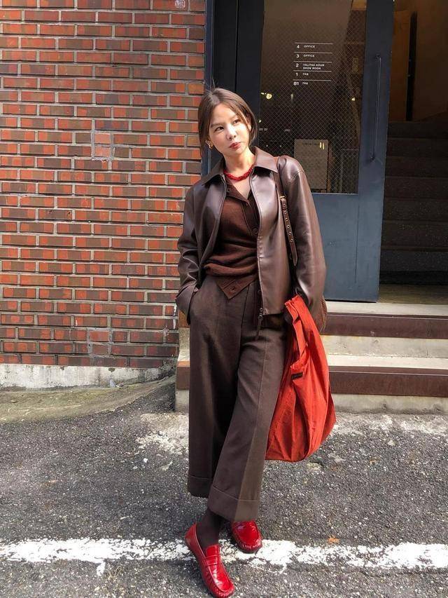 80%棕+20%红:棕色裤子+红色围巾/包包,点睛之笔,告别单调。