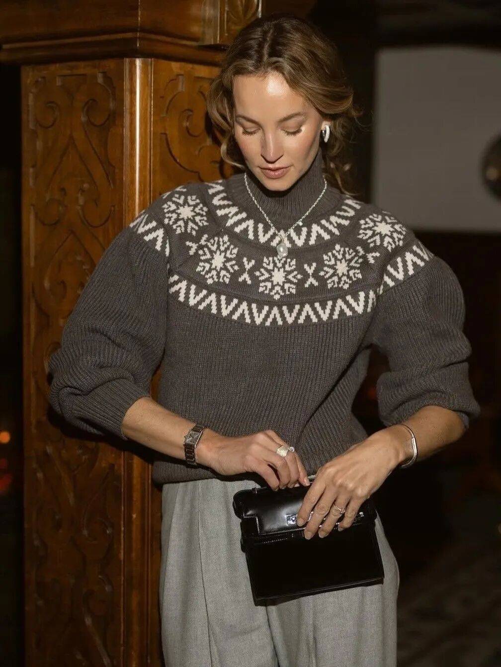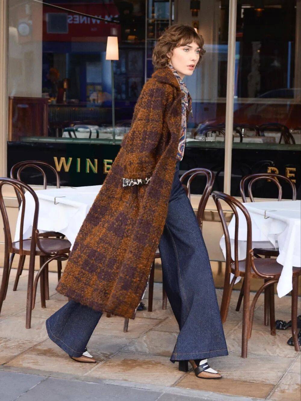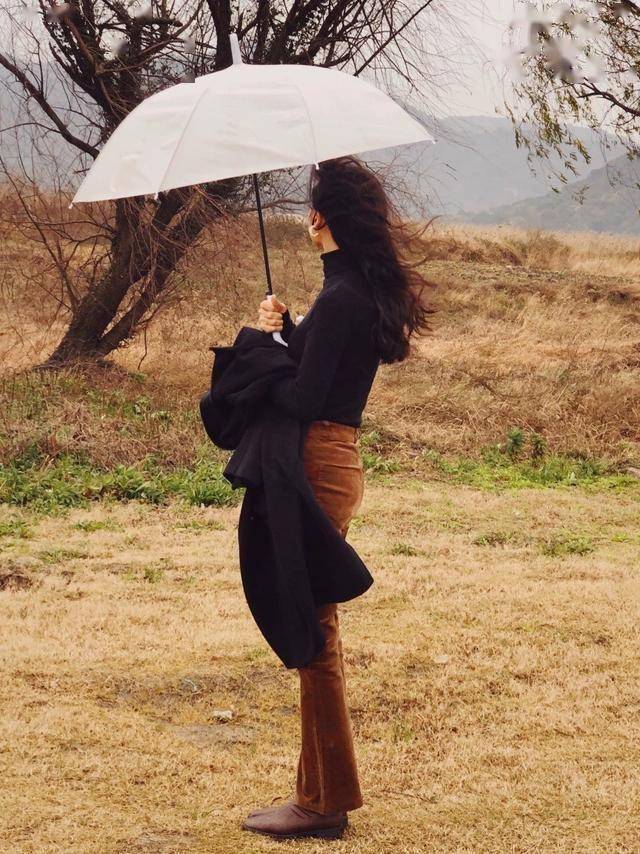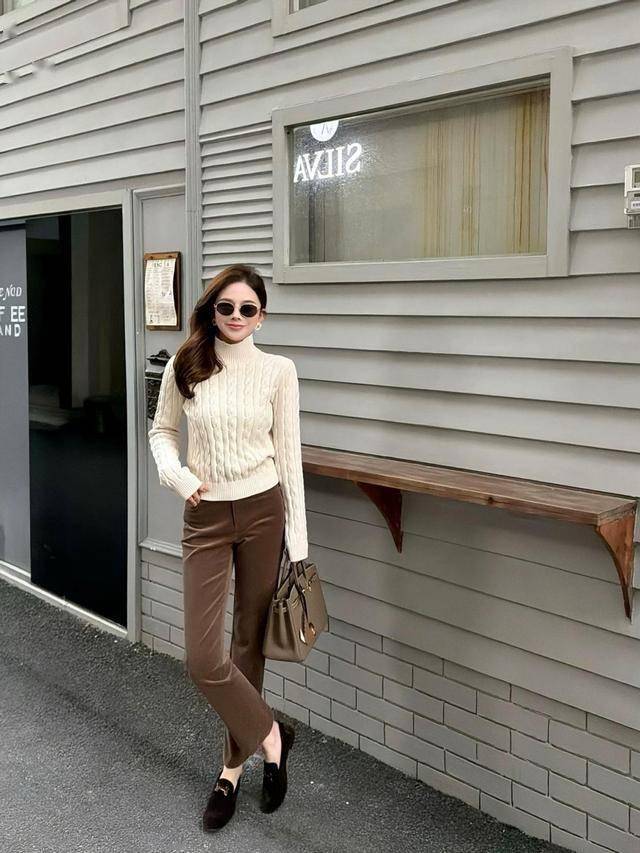 棕色微喇裤:上窄下宽设计,配黑色高领毛衣+长大衣,显瘦又显腿长,小个子福音。