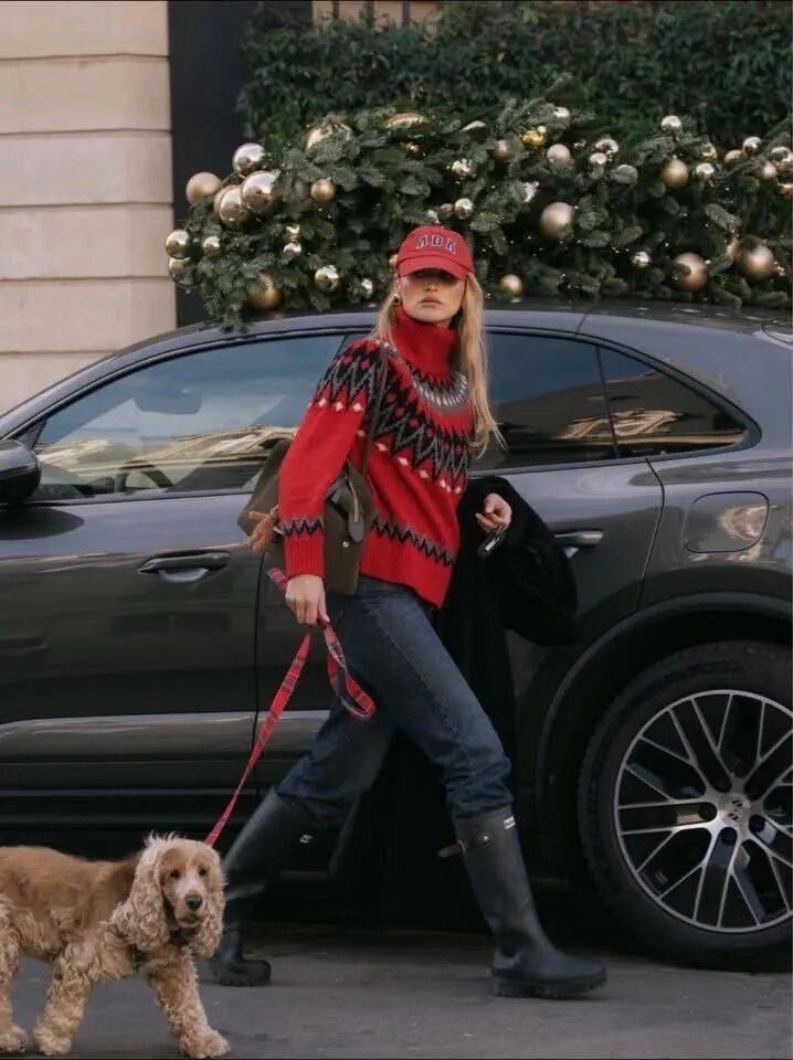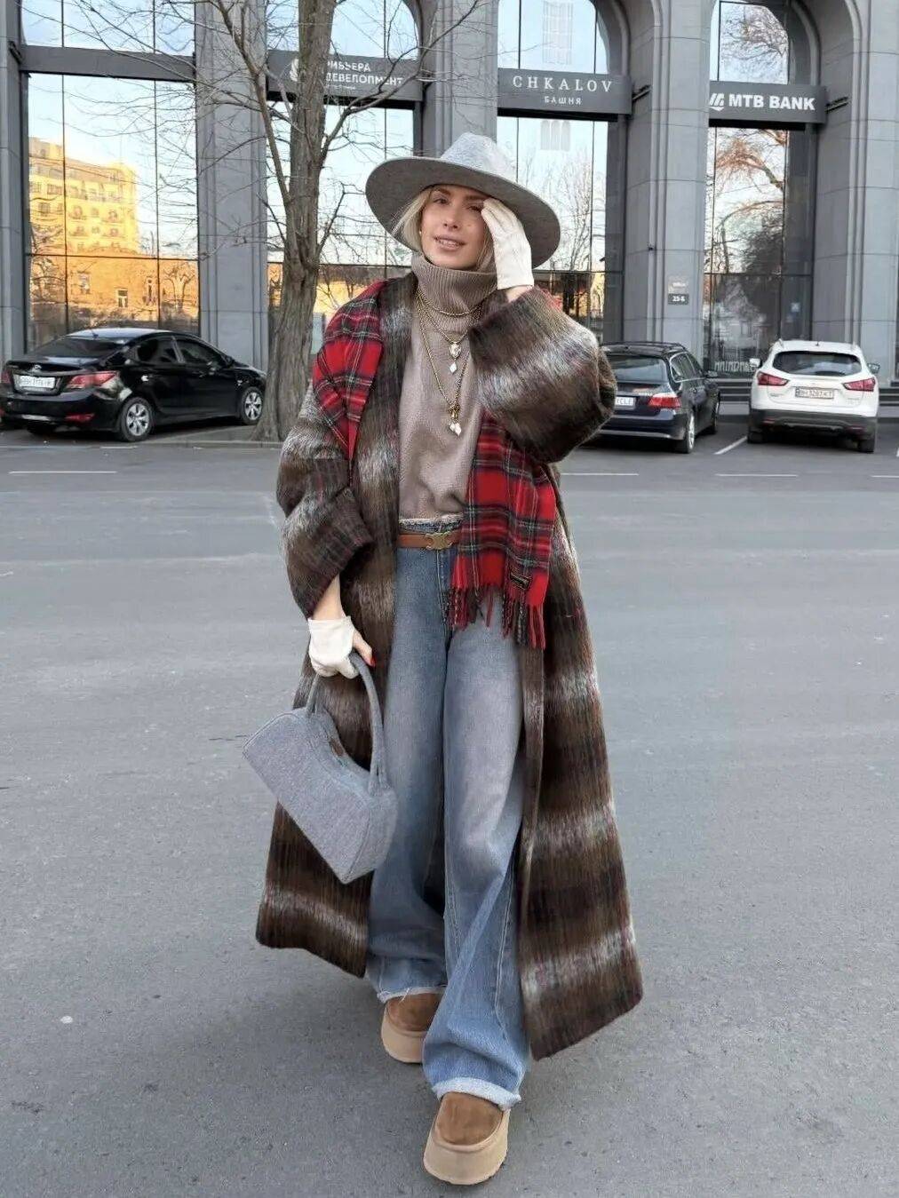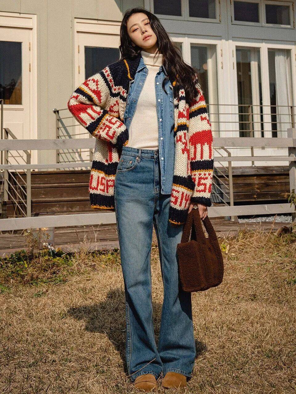 棕色牛仔裤:配麂皮外套+红围巾,力量感与氛围感拉满,适合户外拍照。