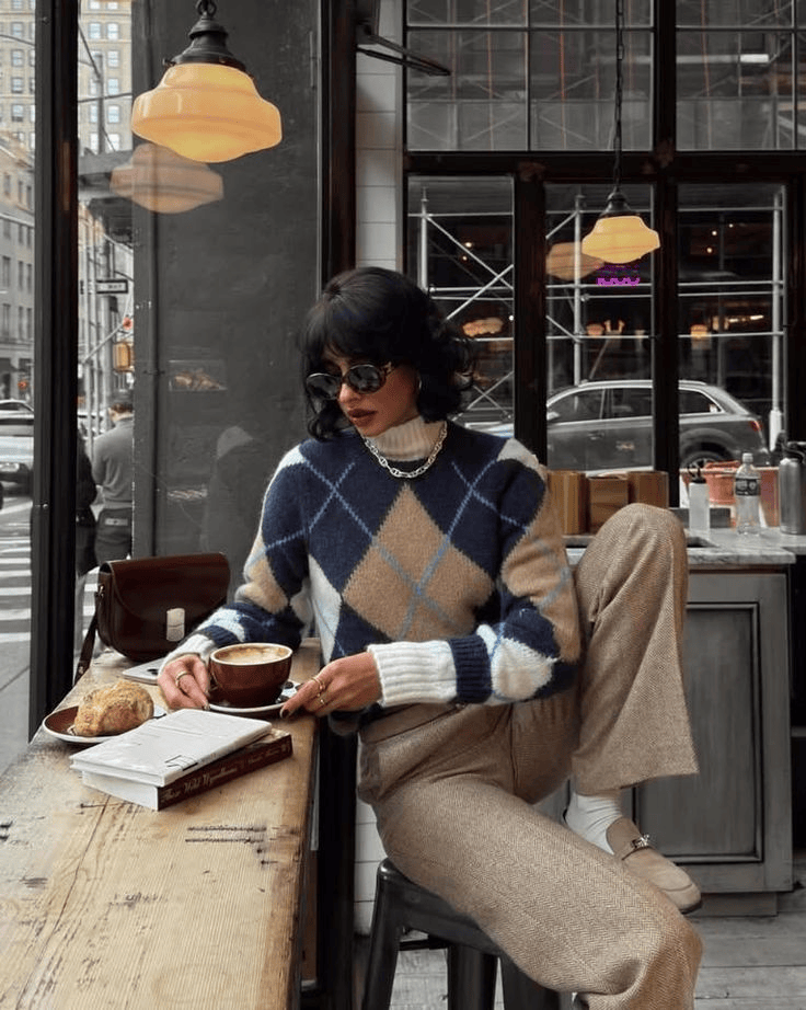 材质对比:一身棕时,用不同材质(如麂皮、羊毛、针织)增加层次感,避免沉闷。