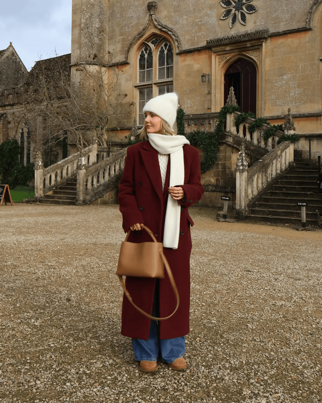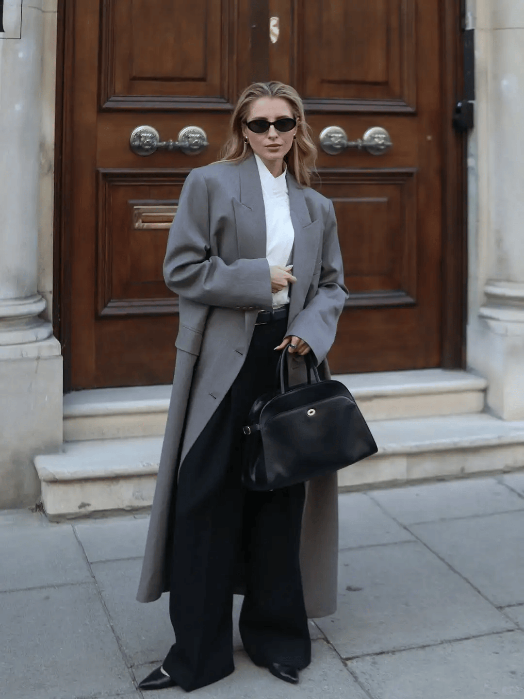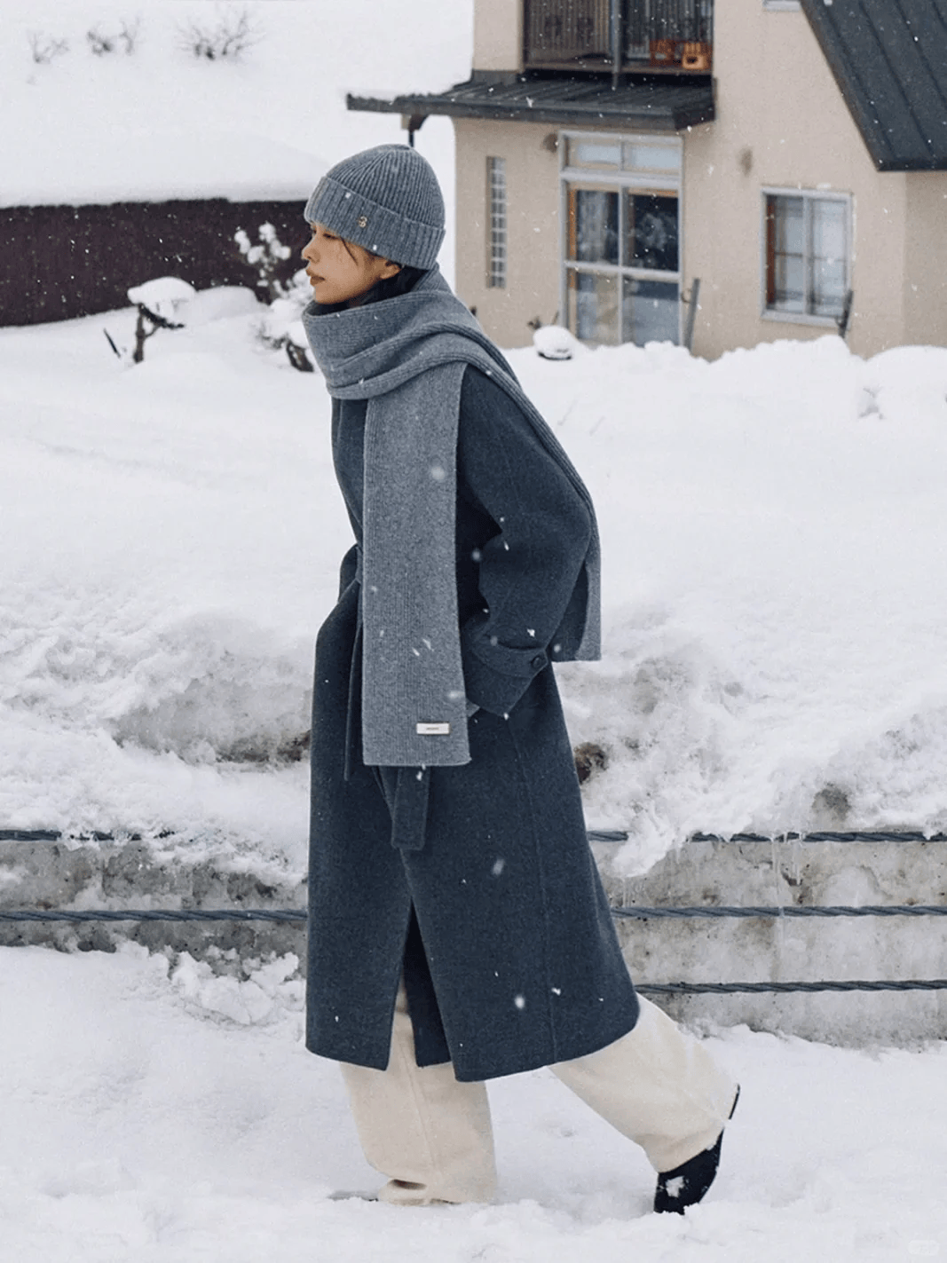 灰色大衣+白色阔腿裤:垂感连成一片,UGG踩出秋冬的温暖节奏。