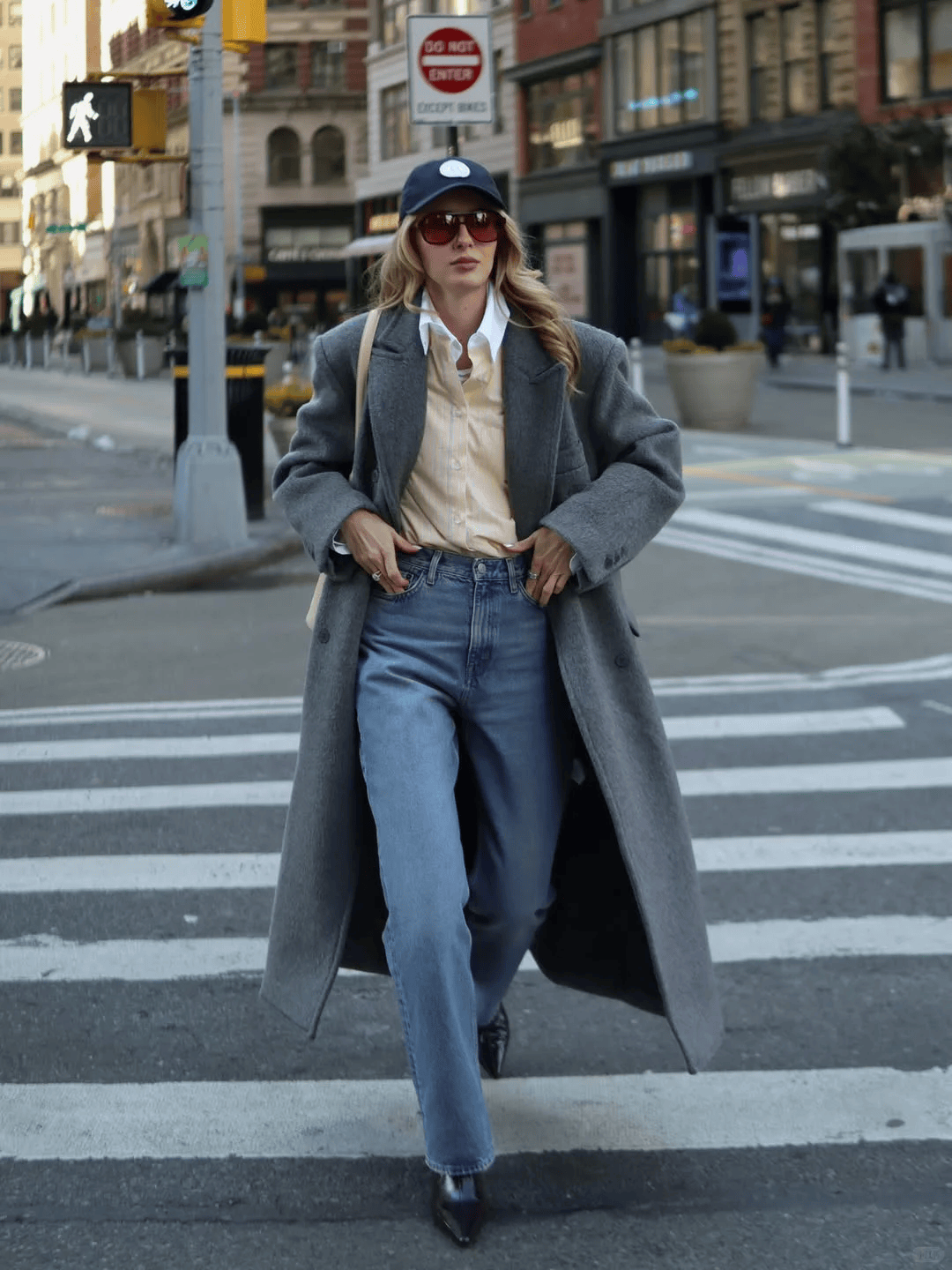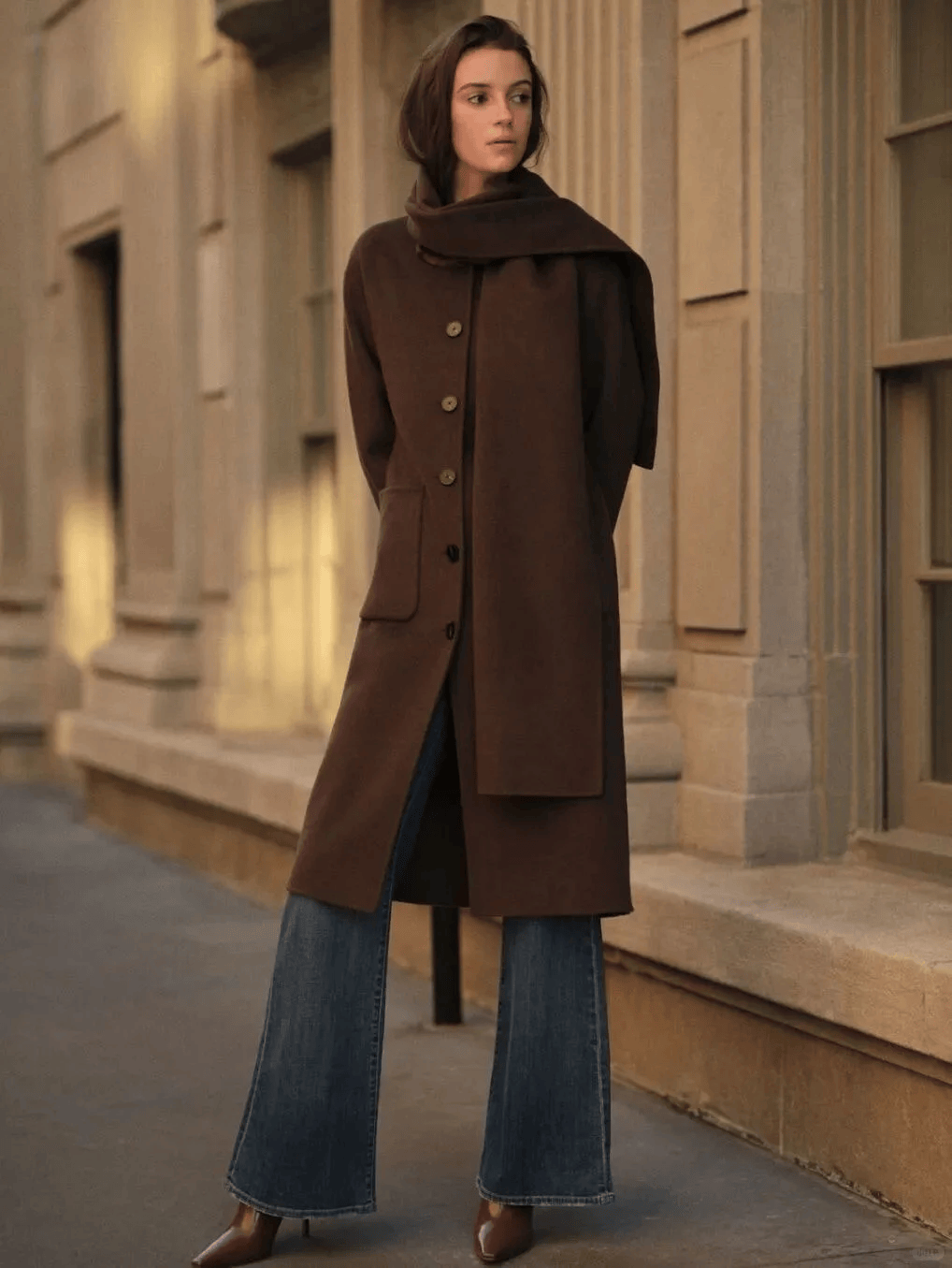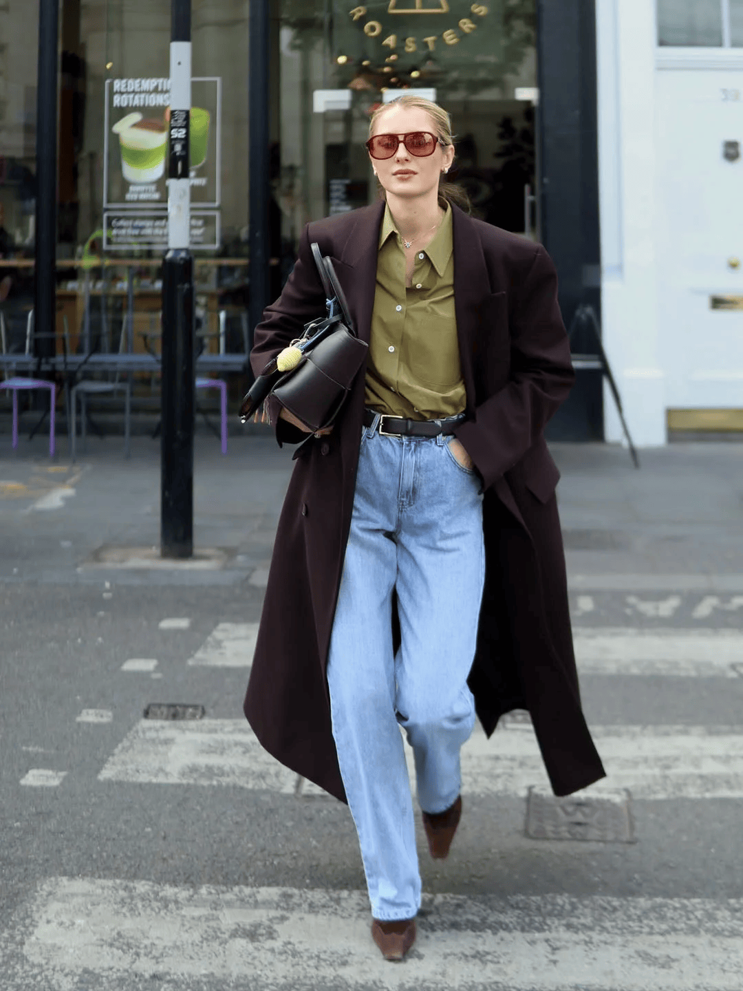 深棕大衣+橄榄绿衬衫+浅蓝牛仔裤:腰带收腰,街头感与复古感碰撞出火花。