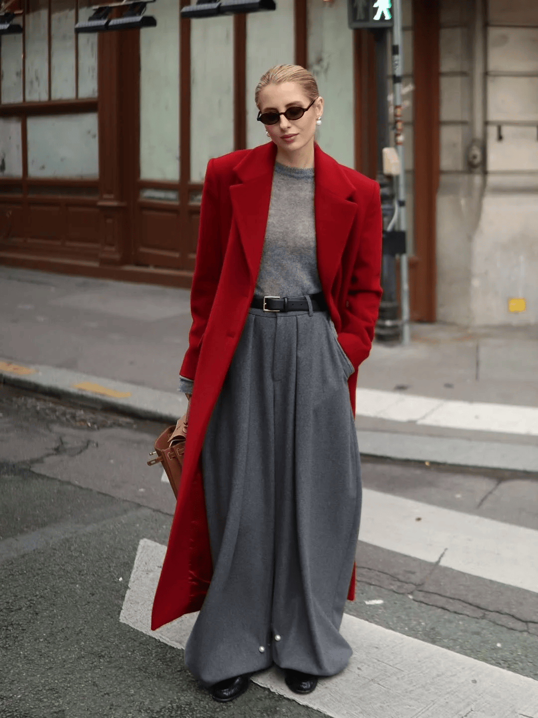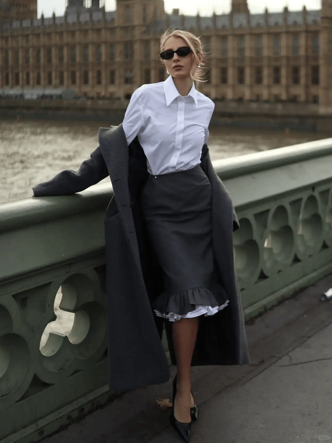 通勤铠甲:白衬衫+灰色阔腿裤,气场全开。