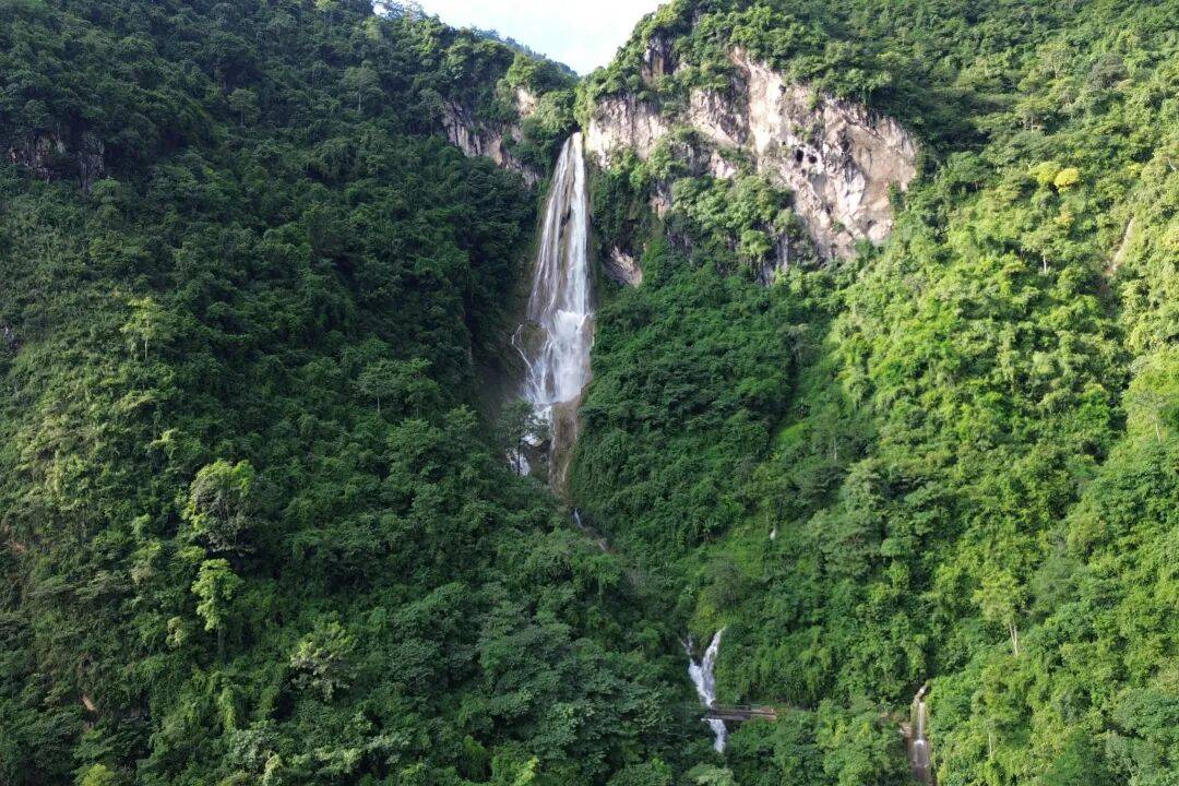 滇越铁路在经过湾塘站附近的滮水岩瀑布时,瀑布从山上飞流直下,形成了瀑布穿越铁路的罕见奇观。