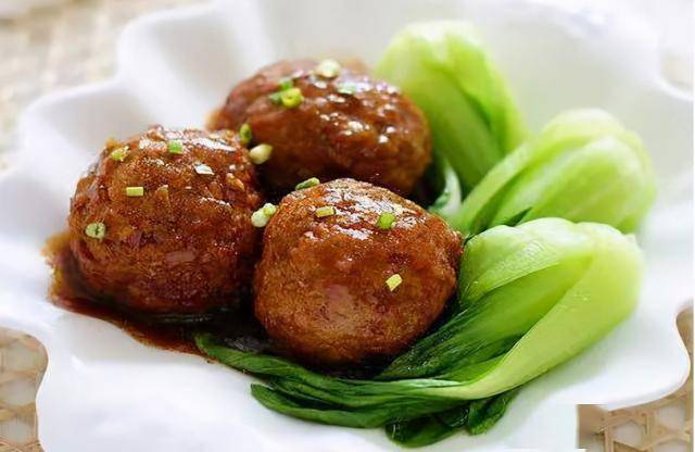 5、将油菜心洗净,煮锅中倒入些水,煮开后放入碱面,放入油菜心,煮几秒钟变色即捞出用冷水冲刷,浸凉后挤去多余水分。藕片放入盘中,摆入油菜心。炒锅大火收汁,分两次放入水淀粉,搅匀,夹起肉丸摆入盘中,再用勺舀些汤汁浇上便可。