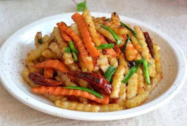 最后将土豆放入锅中,锅内加入少许开水进行翻炒,将水份煸干,放入葱出锅即可。