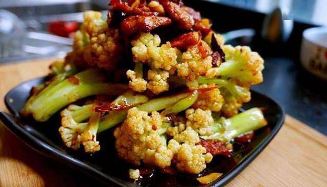 做法花菜洗净掰小朵,不需要太小,就炒碎掉没有口感了;五花肉切薄片,干辣椒剪圈,蒜籽切片待用。