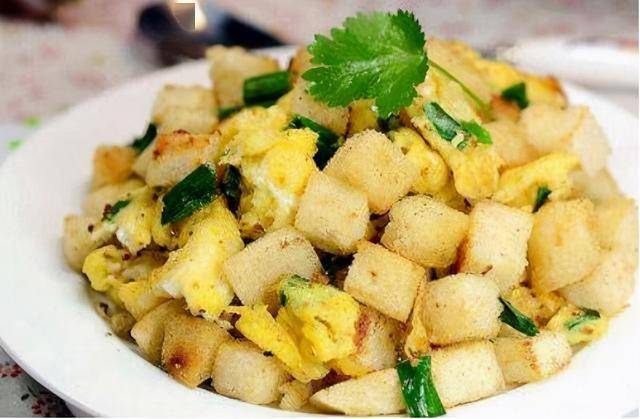 5.热好油,将拌好蛋液的馒头下锅炒好