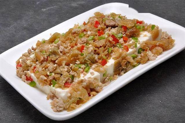 做法:1.将榨菜切成碎,豆腐切小块,排入蒸碗中,撒上榨菜碎;