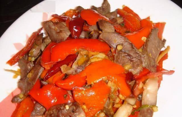 4.锅内放油,烧热,放入辣椒和剩余的葱、姜、蒜煸香,放入猪心片煸炒后起锅盛盘;