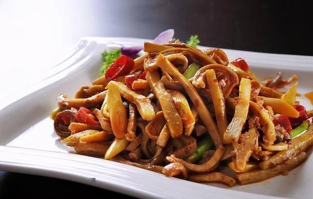 1、将皮肚改刀成饺形片,用鸡汤提前煨制入味;