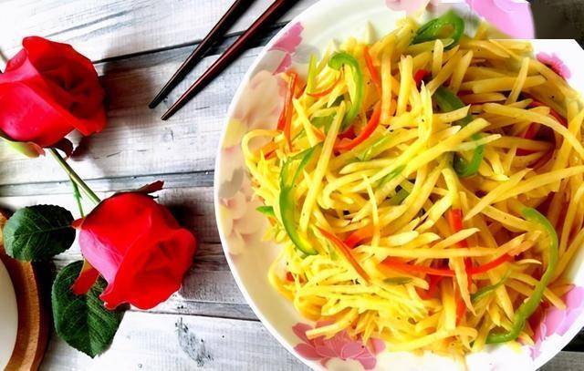 食材:土豆80g、青椒20g、胡萝卜10g 油1勺、盐2g、醋少许、花椒粉 2g