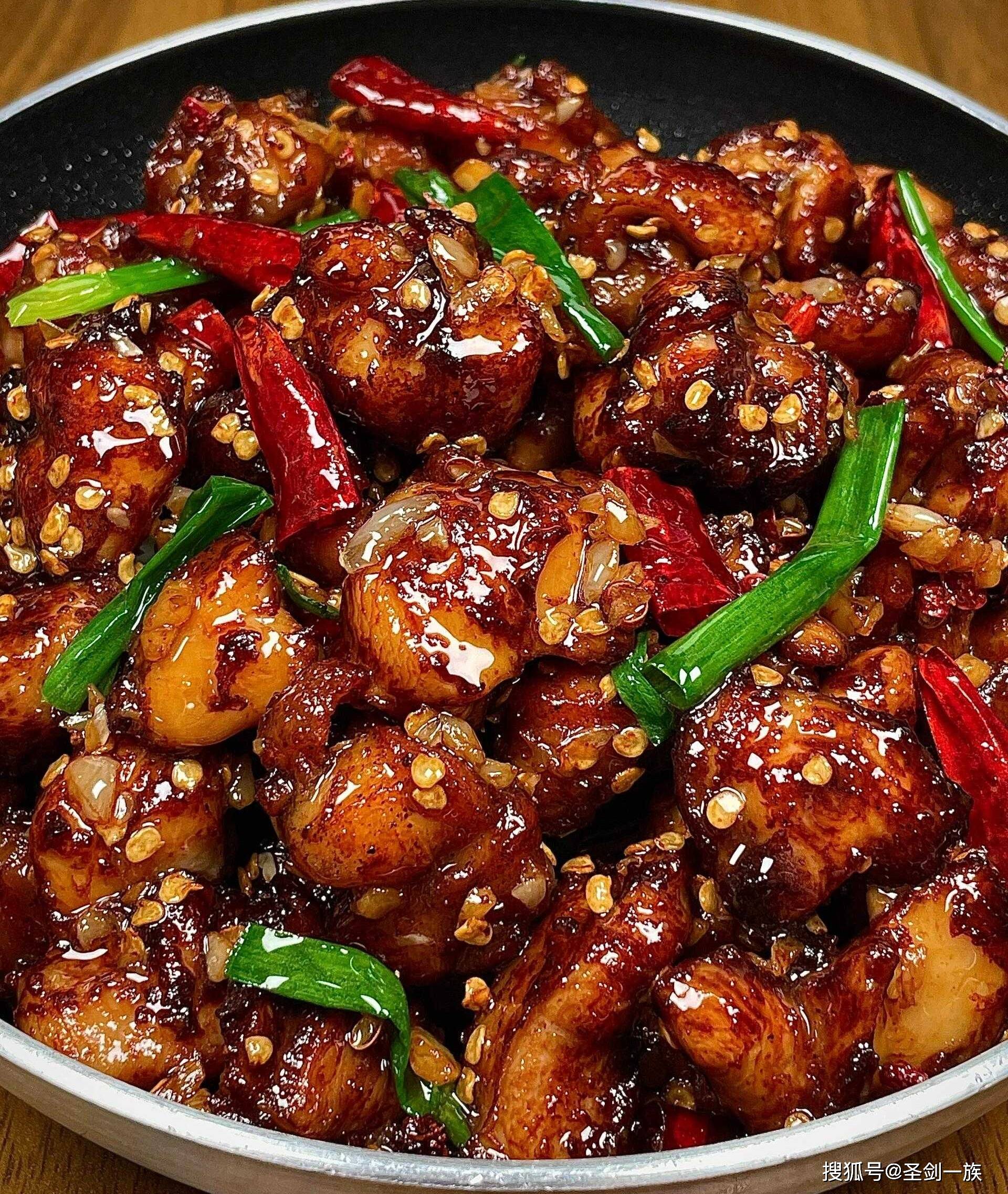4. 倒入炸好的鸡丁,加入葱段快速翻炒,让香料均匀附着即可。