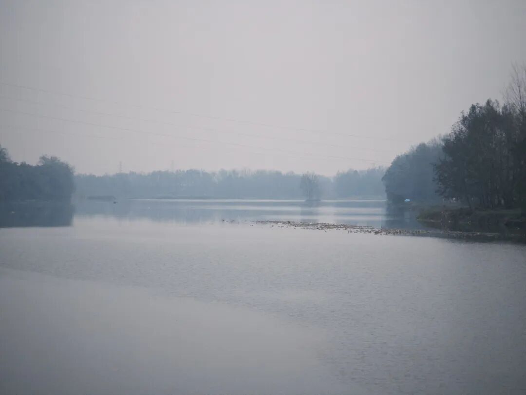 远看冬天的南河带着朦胧的美,在水汽的笼罩下河水蜿蜒伸向远方,水与岸的界限时而清晰时而模糊。