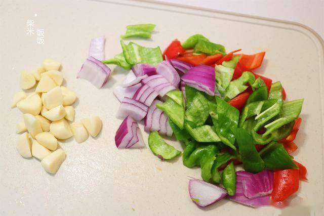 4,再切点青红椒和洋葱。大蒜粒对半切开,能更好出味道。