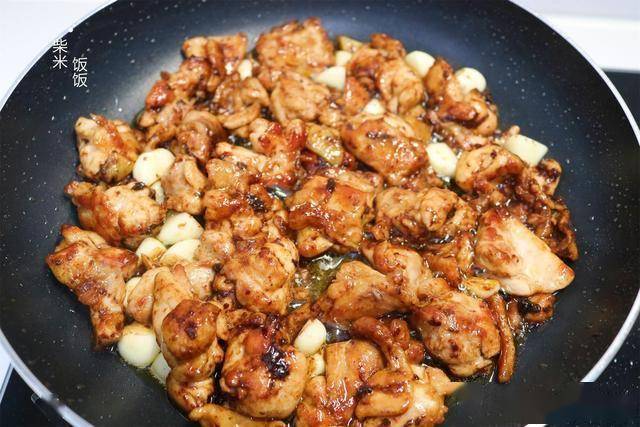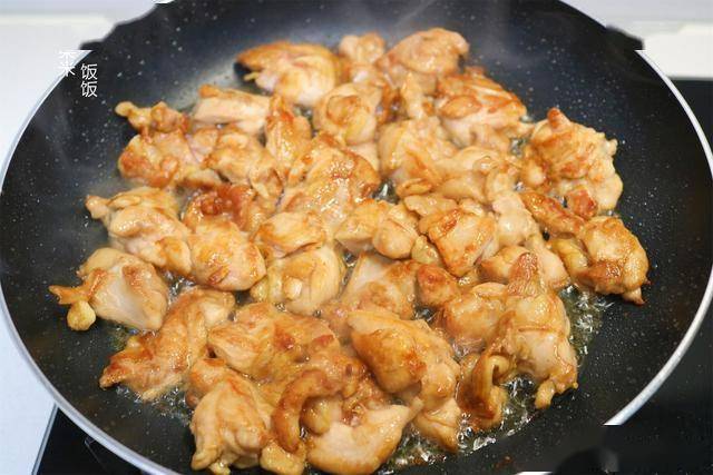 5,接下来热锅热油,把腌好的鸡肉放锅里,中小火翻炒,炒到表面金黄大概就已经七八分熟了。