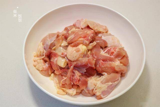 2,切成稍微大块一点的鸡肉,记得切之前一定要把鸡肉的水擦干,不然后面炒的时候容易出水。